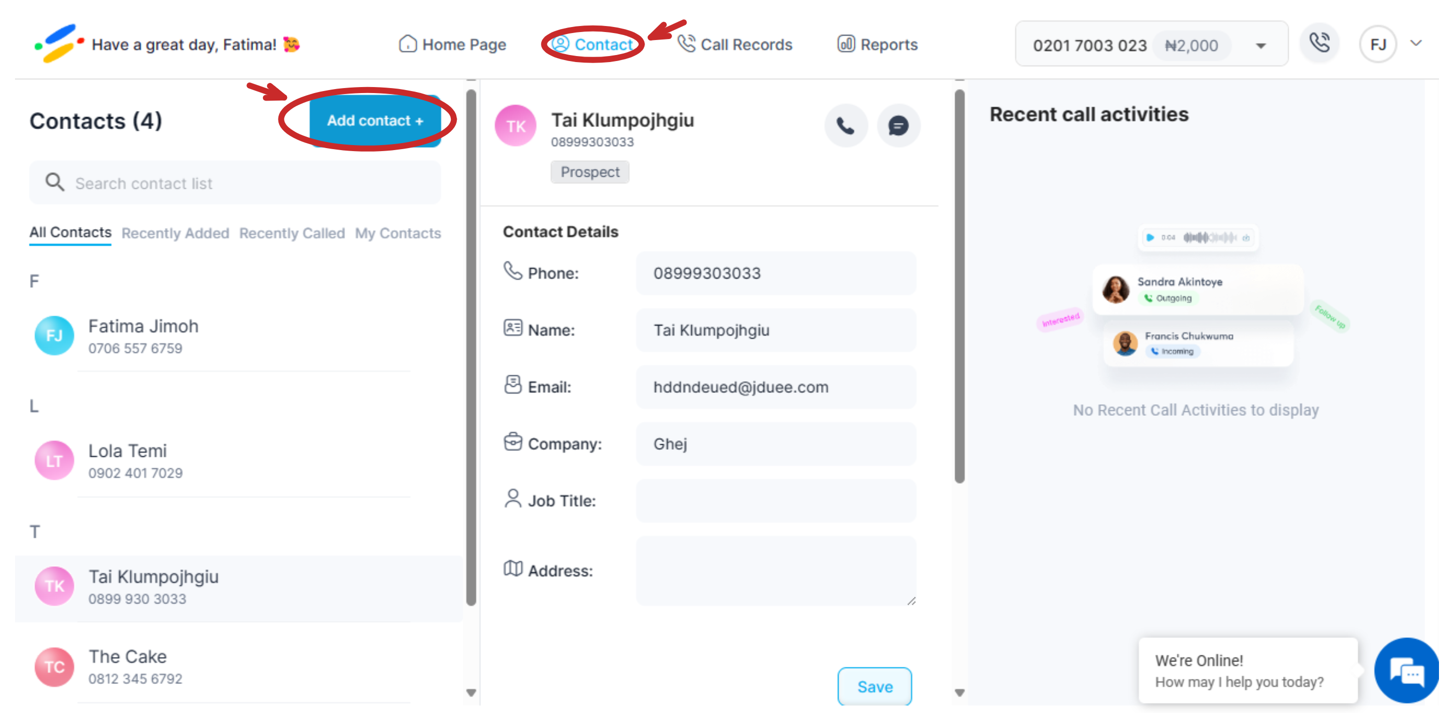 2. To Add contact, click Contacts on the left sidebar on your screen and click +Add from the right sidebar on your screen