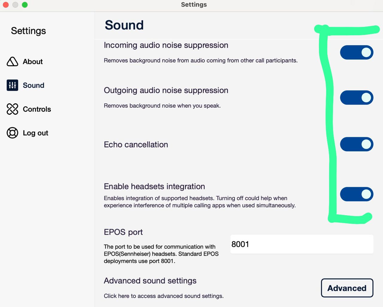 Scroll down and locate Incoming audio noise suppression, Outgoing audio Suppression and Echo Cancellation.